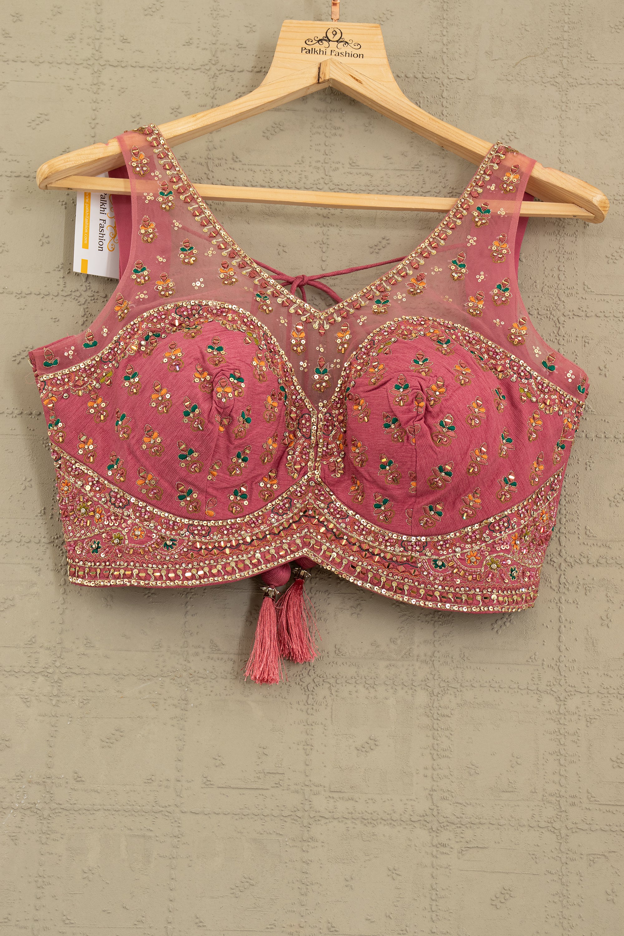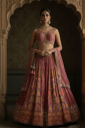 Step into refined luxury with this Rosewood Pink Patola Weave Lehenga Choli by Palkhi Fashion. The muted rosewood base is beautifully balanced with warm orange, magenta, and gold hues, creating a vintage-inspired festive glow. The blouse showcases exquisite hand embroidery with stones, mirrors, cutdana, and multicolor threadwork — blending tradition with a chic fusion appeal. The soft silk dupatta adorned with delicate butti and silk borders completes this timeless silhouette.