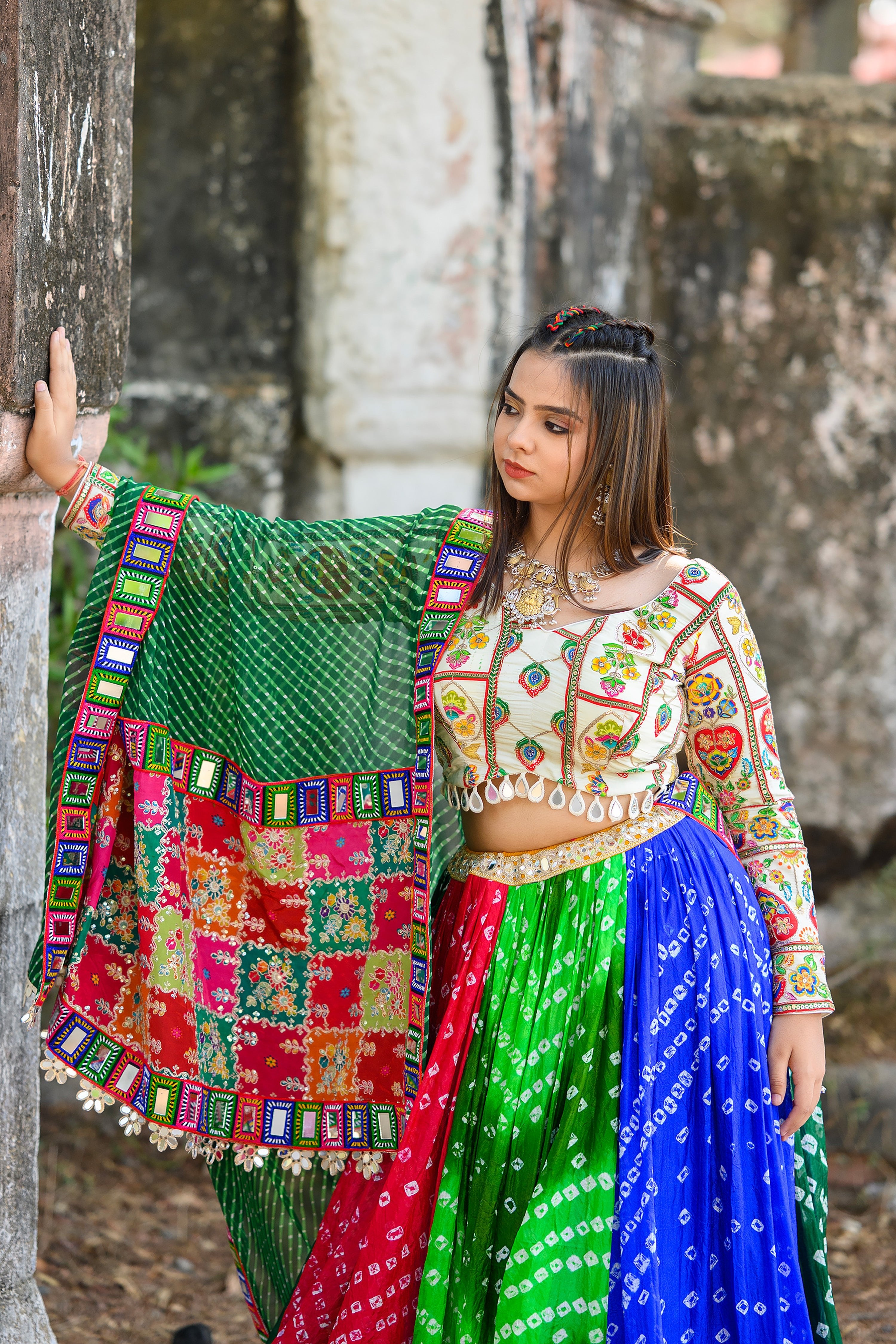 Celebrate the vibrant spirit of Navratri in this multi-color Bandhani designer Chaniya Choli from Palkhi Fashion. The lehenga is a masterpiece of traditional artistry, featuring a stunning blend of bandhani on soft georgette, leheriya, gamthi work, kutchi embroidery, mirror work, patchwork, and exquisite abhla detailing. The coordinated blouse showcases multi-color thread embroidery, perfectly balanced with a green leheriya dupatta enhanced with mirror and traditional thread work accents, adding extra charm to this attire. This ensemble embodies the festive essence of Navratri with every swirl—perfect for garba nights, dandiya, and traditional celebrations.