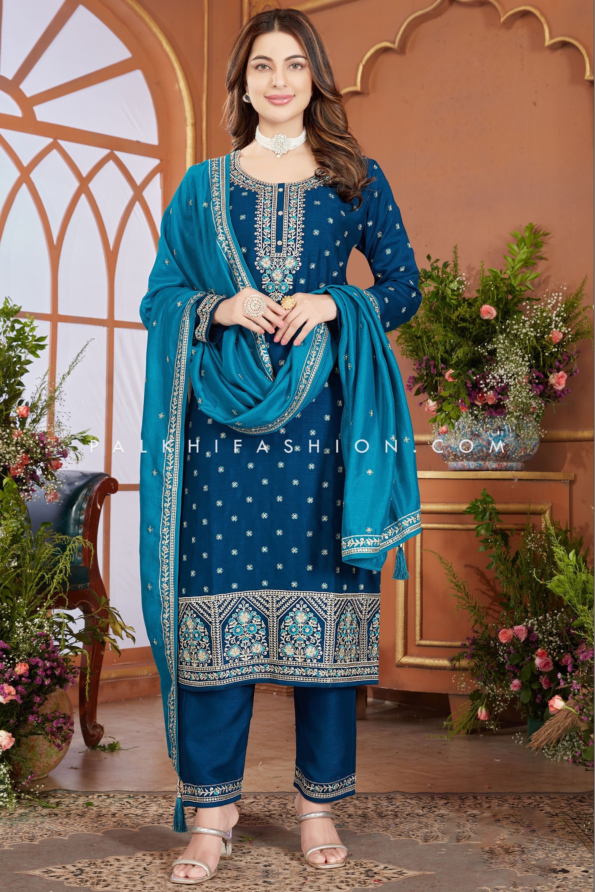 Embrace elegance with the Blue Soft Silk Straight-Cut Suit from Palkhi Fashion. This stunning ensemble features thread embroidery, petite stone accents, and meticulous handwork that enhance its luxurious appeal. Paired with soft silk matching pants and a light blue dupatta adorned with captivating embroidery work