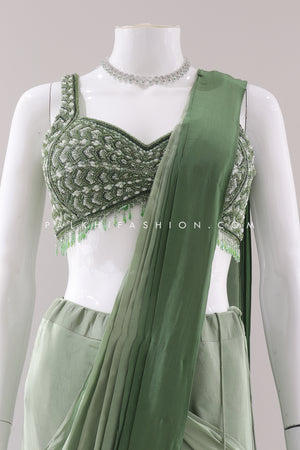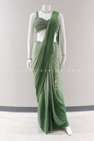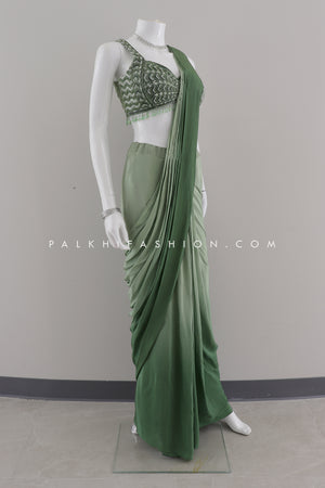 Embrace effortless elegance with this Designer Green Ombre Ready-to-Wear Saree from palkhi fashion. This stunning saree is crafted from soft crape silk and features a mesmerizing ombre effect. The pre-draped design makes it easy to wear, while the intricate handwork, shimmering stones, sequins, and cutdana work add a touch of sparkle and glamour. Perfect for parties, weddings, or any special occasion.