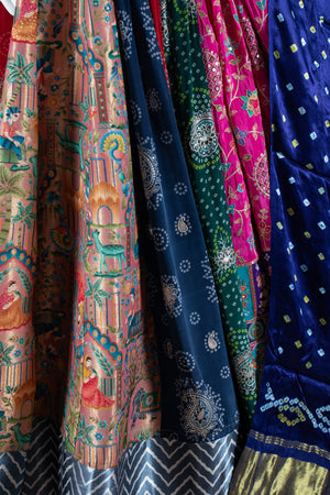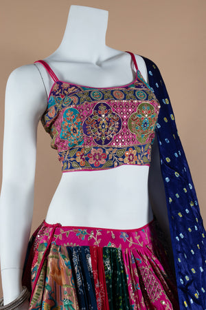 Experience the perfect blend of tradition and modernity with this Designer Multicolor Navratri Chaniya Choli from Palkhi Fashion. The vibrant lehenga is beautifully adorned with multicolor bandhani embroidery, vintage thread work, silk weaving, resham, gamthi, and kutchi embroidery, enhanced by intricate border work and appealing patterns throughout. The spaghetti strap blouse features elegant multicolor motifs and detailed thread embroidery, showcasing clean craftsmanship and a flattering cut. The look is completed with a stunning blue pure gaji silk bandhani dupatta, making this ensemble an ideal choice for Garba nights, festive celebrations, and wedding events.