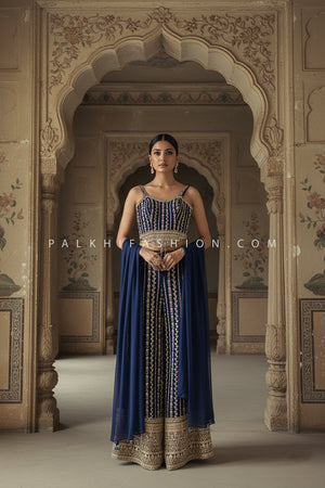 Step into the realm of royal elegance with this Navy Blue Palazzo Set by Palkhi Fashion. The stunning corset-style top is hand-embellished with meticulous bead,mirrors, sequin, petite stone, hand work detailing—sculpting a silhouette that celebrates confidence and grace. Paired with flowing palazzo pants featuring intricate embroidery at the hem and a soft chokar dupatta, this look defines luxury reimagined for the modern muse.
