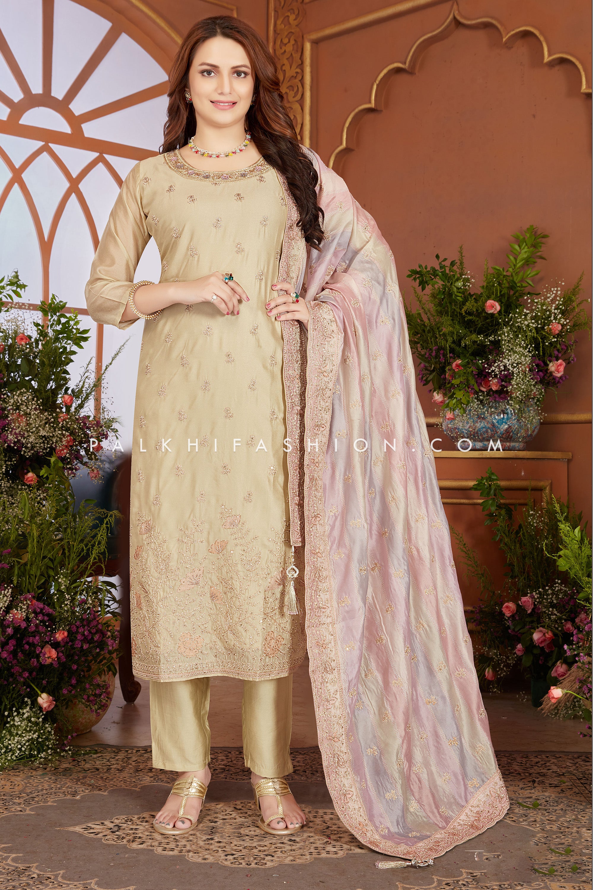 Embrace the allure of timeless style with Palkhi Fashion’s Beige Soft Silk Straight-Cut Suit. The top showcases elegant thread embroidery, and delicate stonework, enriched with meticulous handcrafting. Complete with matching pants and a stunning lilac/mauve color silk embroidered dupatta, this ensemble radiates sophistication and charm.