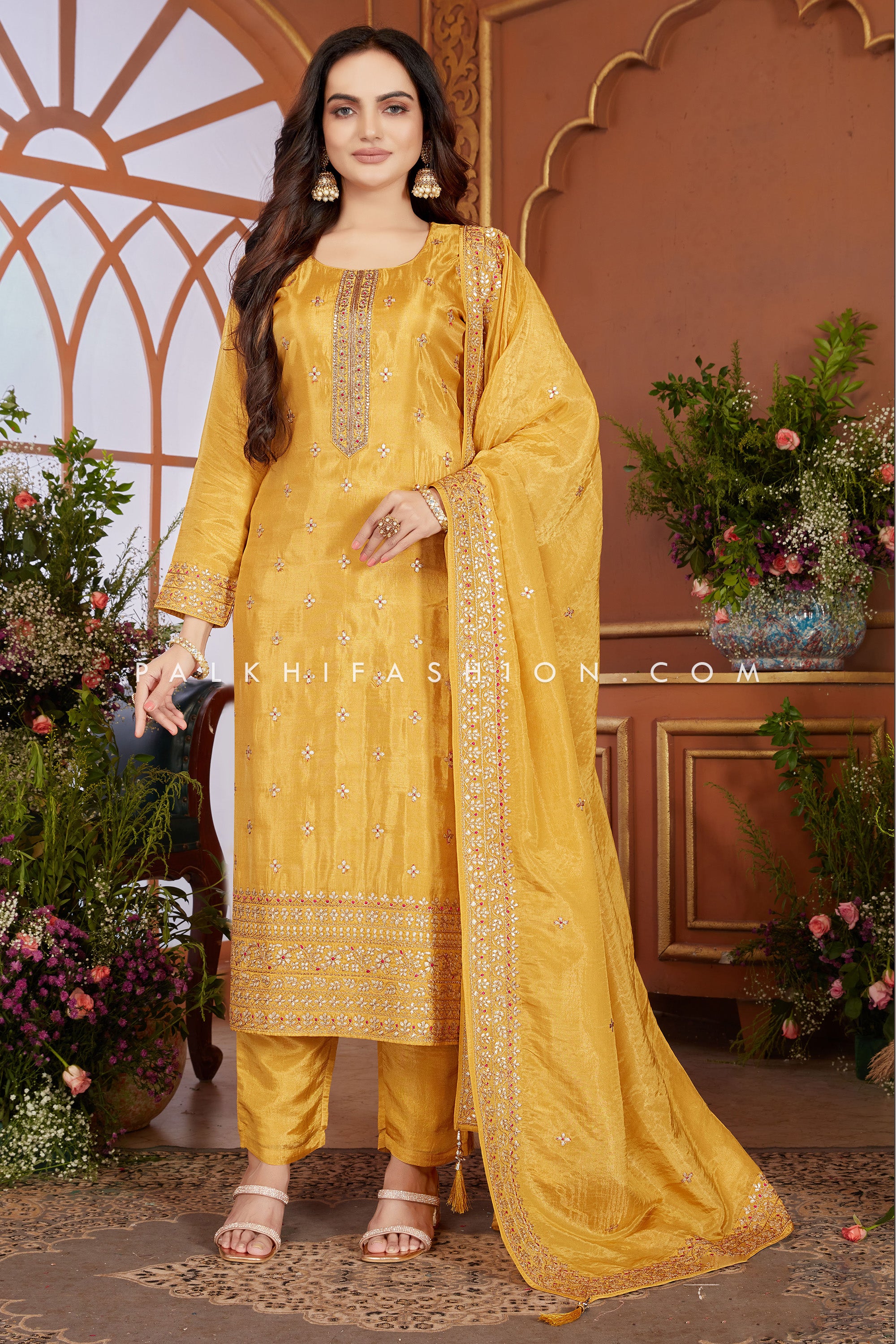 Discover the charm of yellow Soft Silk Straight-Cut Suit. The top showcases a beautiful blend of thread embroidery, petite stones, and delicate handwork, all crafted with enchanting precision. Complemented by matching soft silk pants and dupatta with eye-catching embroidery, this suit is a statement of refined elegance.