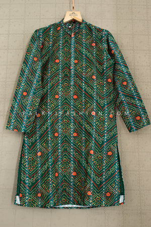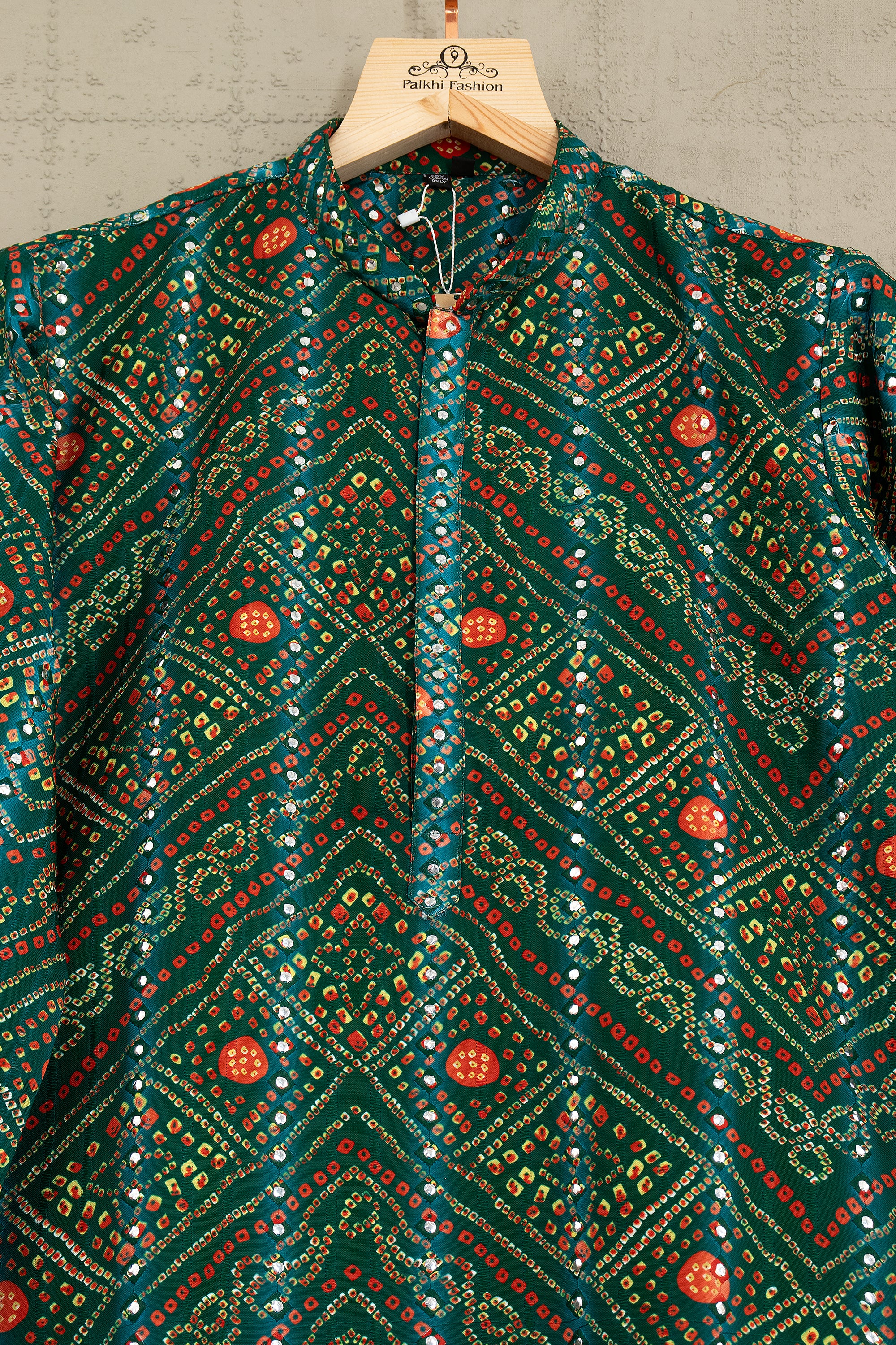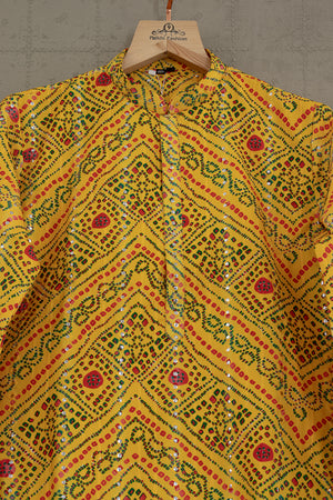 Celebrate the beauty of tradition with this vibrant Bandhani Kurta Pants Set by Palkhi Fashion. Crafted with authentic bandhej-style prints and highlighted with Abhla (mirror) & thread work, it exudes festive radiance. Perfect for garba nights, haldi events, and cultural celebrations.