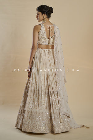 Exude elegance in this Champagne Color Designer Lehenga Choli from palkhi fashion. This exquisite ensemble features a pure georgette lehenga with full flair, adorned with intricate handwork, delicate sequin embroidery, and thread work. The stunning designs and border work add a touch of regal charm. The blouse is embellished with beautiful handwork, stones, kundan, sequins, and thread work, creating a harmonious and flattering silhouette. The matching embroidered dupatta completes the look with grace and sophistication.