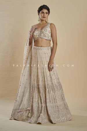 Imperial Charm: Exclusive Champagne Lehenga Choli with Handwork