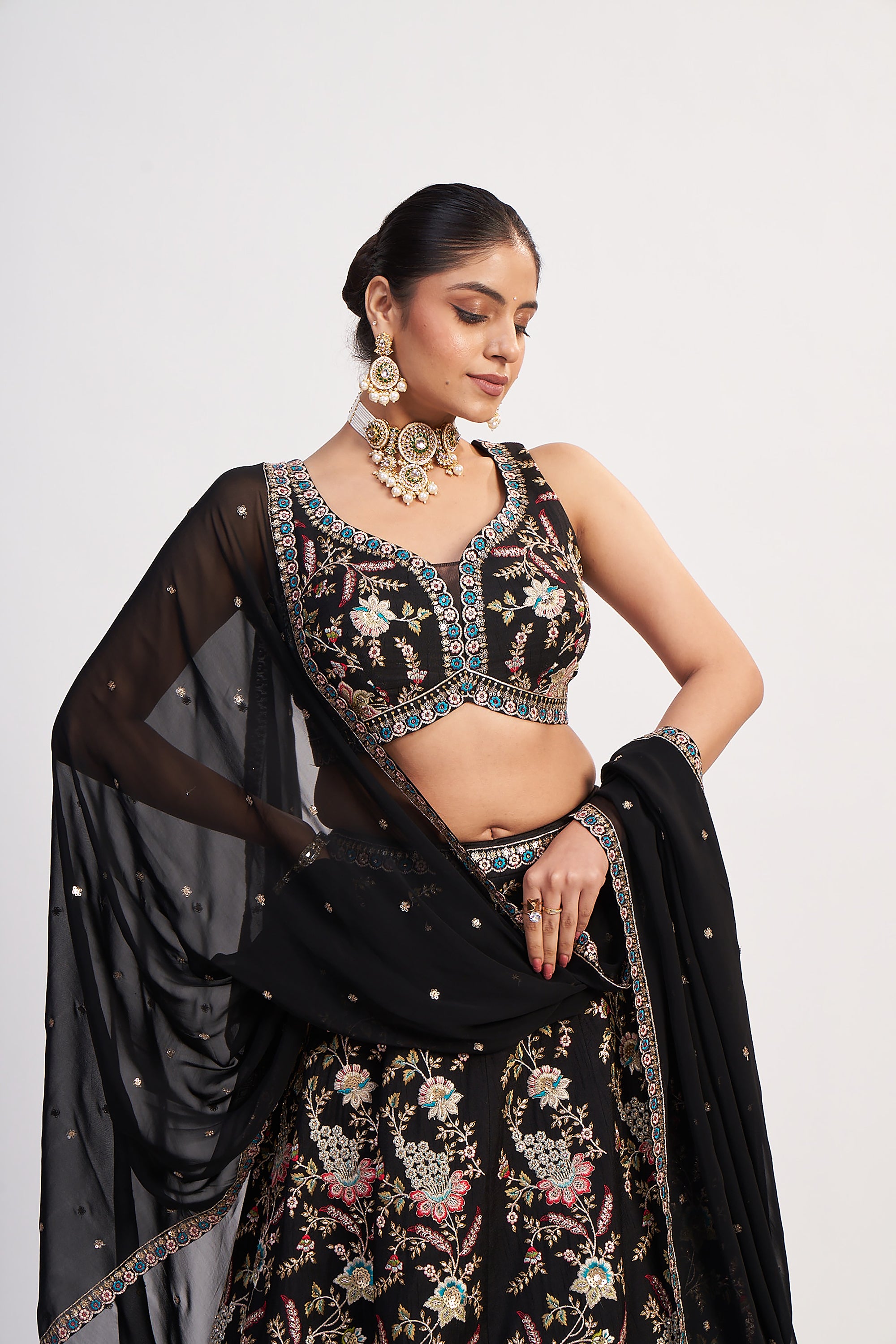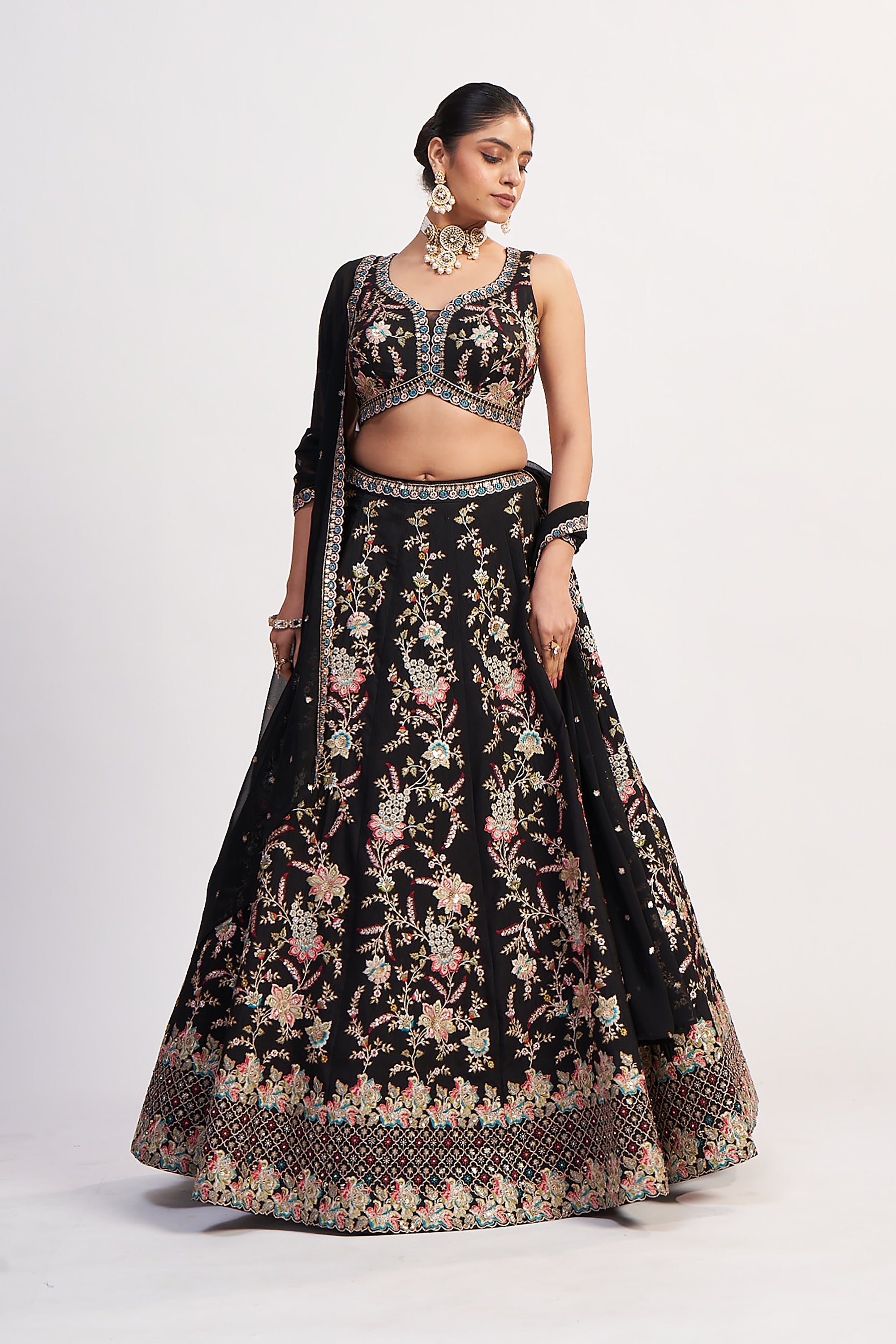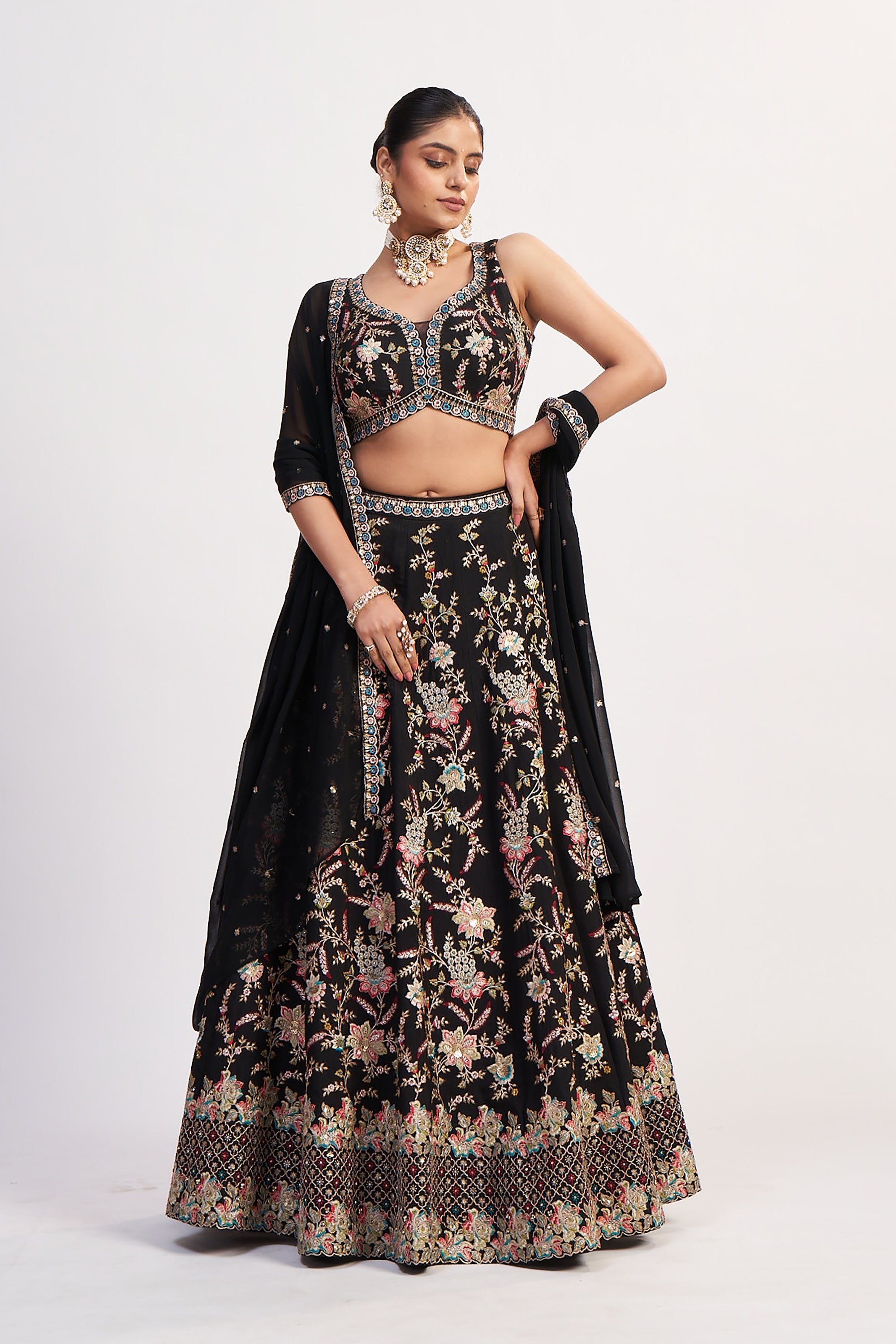 This breathtaking black lehenga choli is a masterpiece of multicolor thread embroidery, sequin highlights, and refined cutdana detailing—perfect for bridesmaids, receptions, sangeet nights, or luxury festive wear. The floral jaal embroidery flows gracefully across a full-flare skirt, creating movement, sparkle, and richness with every step. The designer blouse features sculpted floral motifs, intricate handwork, beads, and a beautifully shaped neckline for an elegant, modern silhouette. Paired with a soft dupatta enriched with scattered bootis and embroidered borders, this ensemble blends tradition and couture with ease. A signature Palkhi Fashion Houston show-stopper.