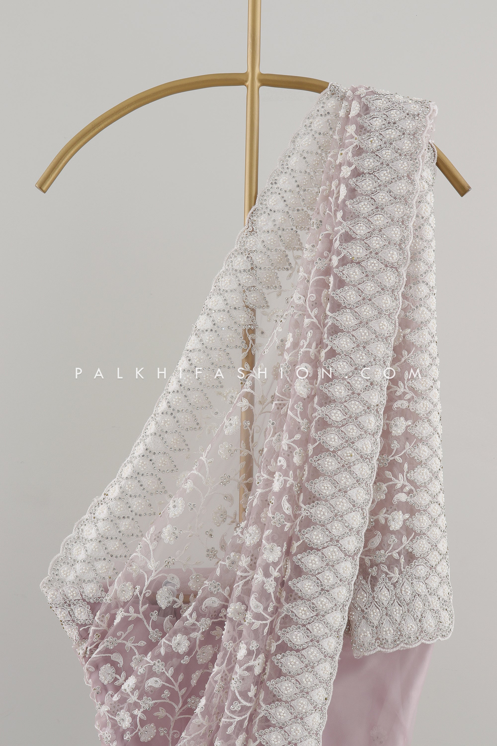 Steal the spotlight in this Blush Lilac Designer Saree from Palkhi Fashion. This exquisite saree is adorned with elegant embroidery, delicate petite stones, and shimmering pearls, creating a look that's both sophisticated and glamorous. The attractive pattern and intricate threadwork add a touch of timeless elegance. The unstitched blouse allows you to customize the fit and style, ensuring a truly personalized look that will make you feel like a celebrity.