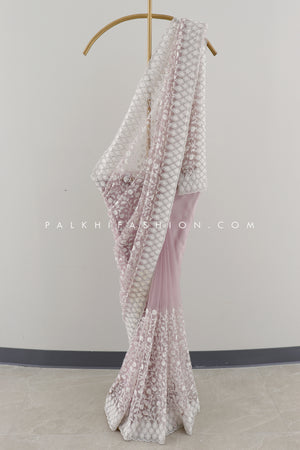 Luxe Lilac: Embellished Designer Blush Lilac Saree with Pearl & Stone Work
