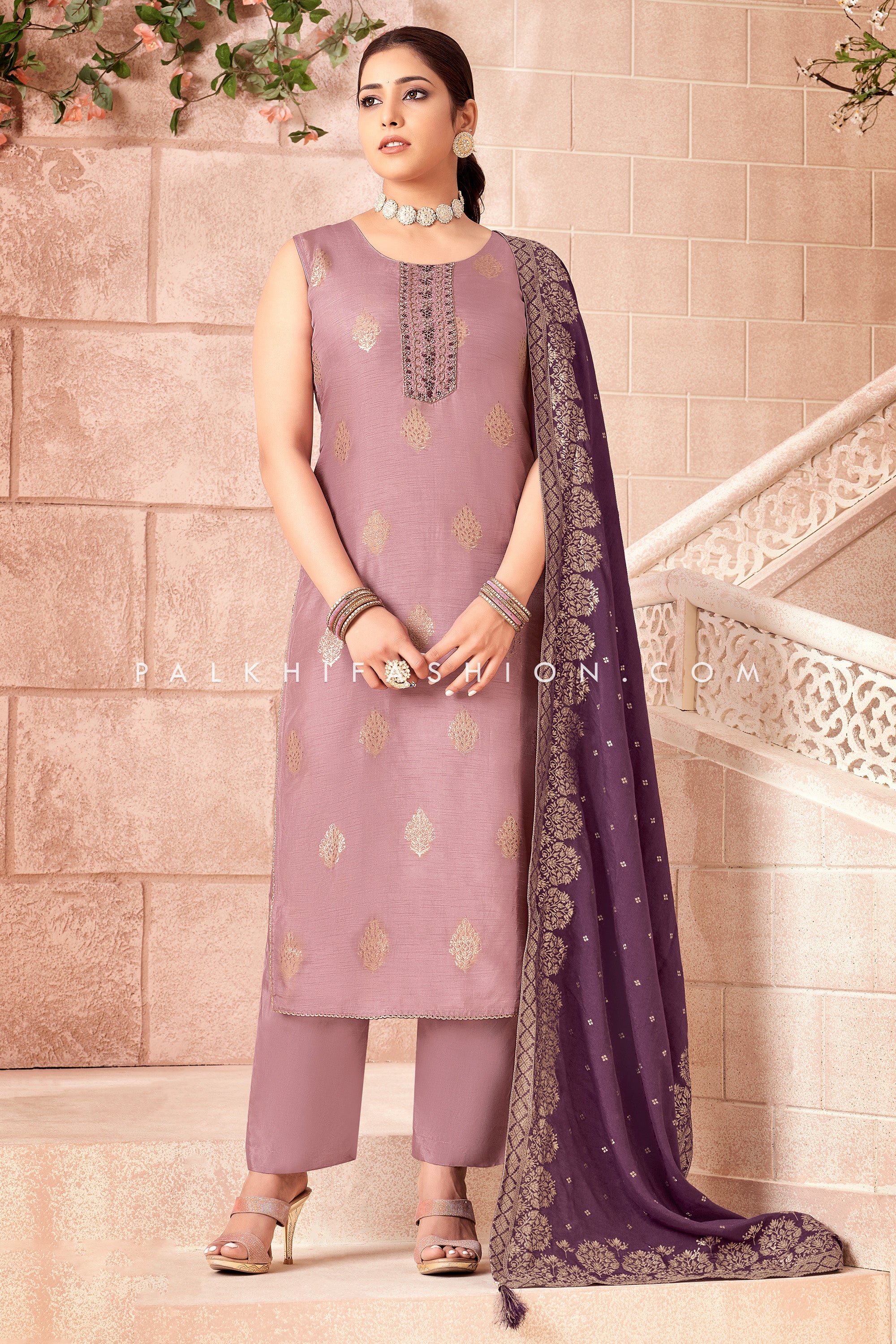 Mauve Soft Silk Straight Cut Suit With Elegant Work