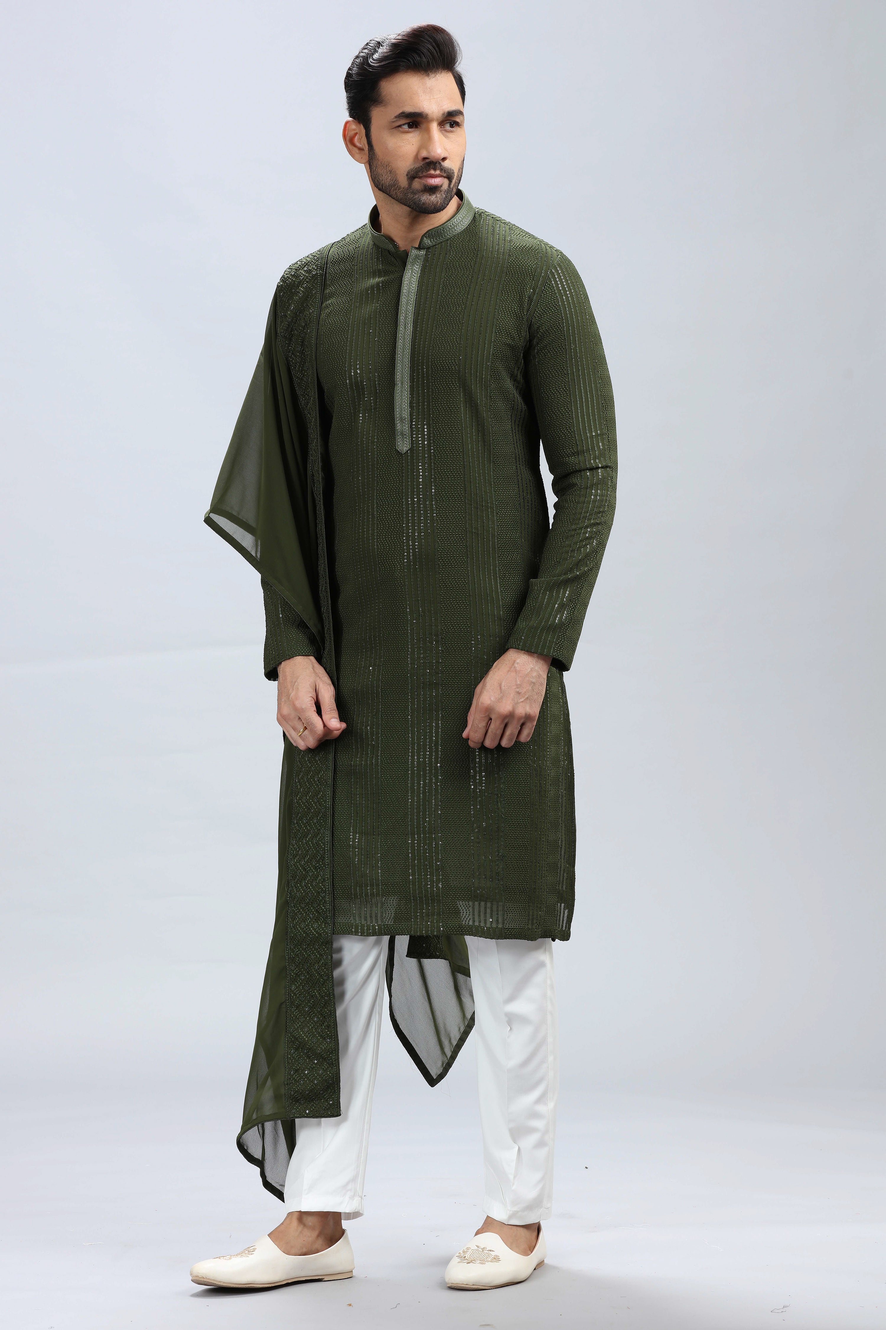 Step into refined elegance with this Mehndi Green Georgette Kurta Pajama Set from Palkhi Fashion, beautifully crafted with intricate threadwork and petite sequin embroidery that forms a timeless, enchanting pattern. The embroidery gracefully enhances the fabric, offering a perfect blend of traditional artistry and modern sophistication. Comes with matching dupatta and pants.