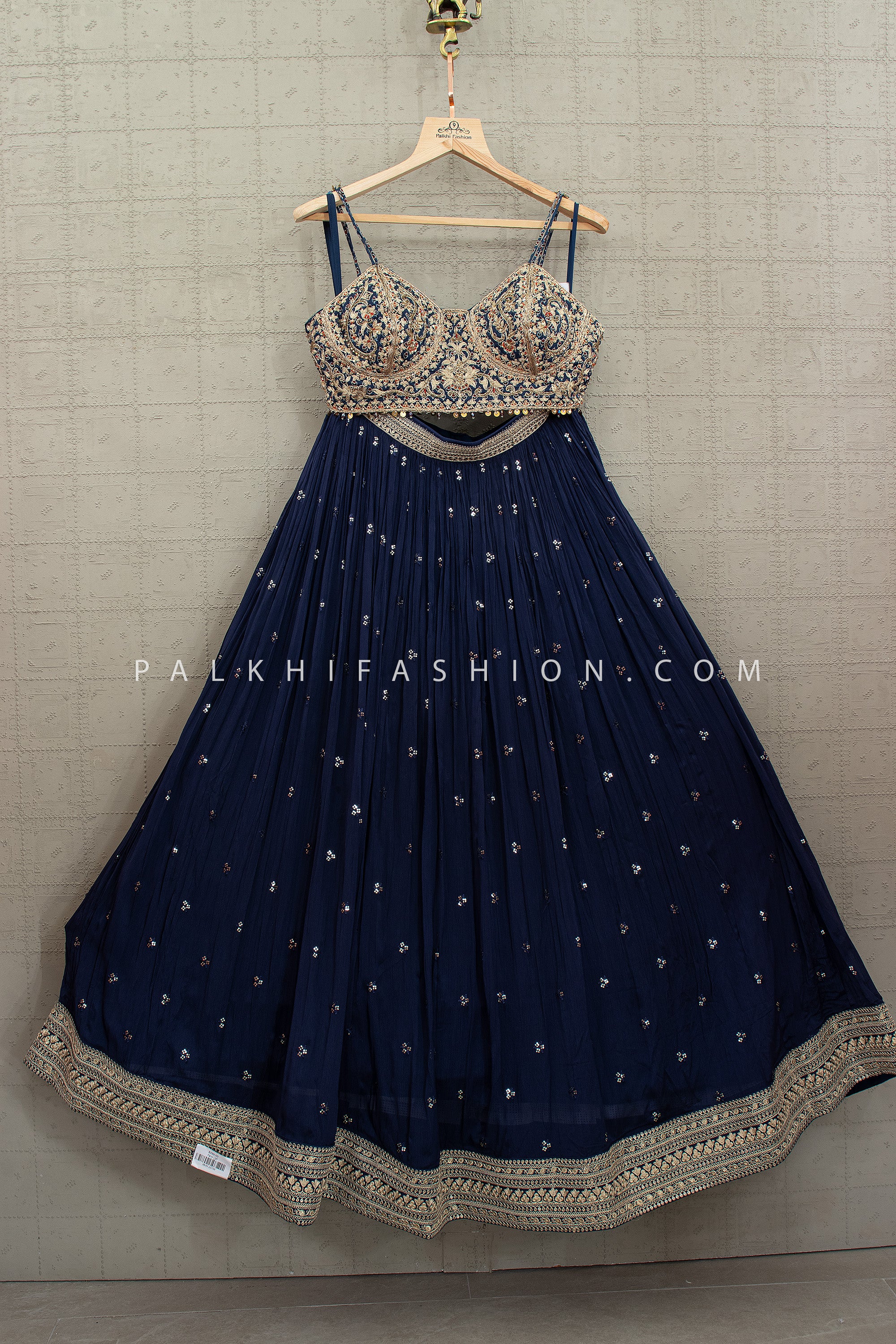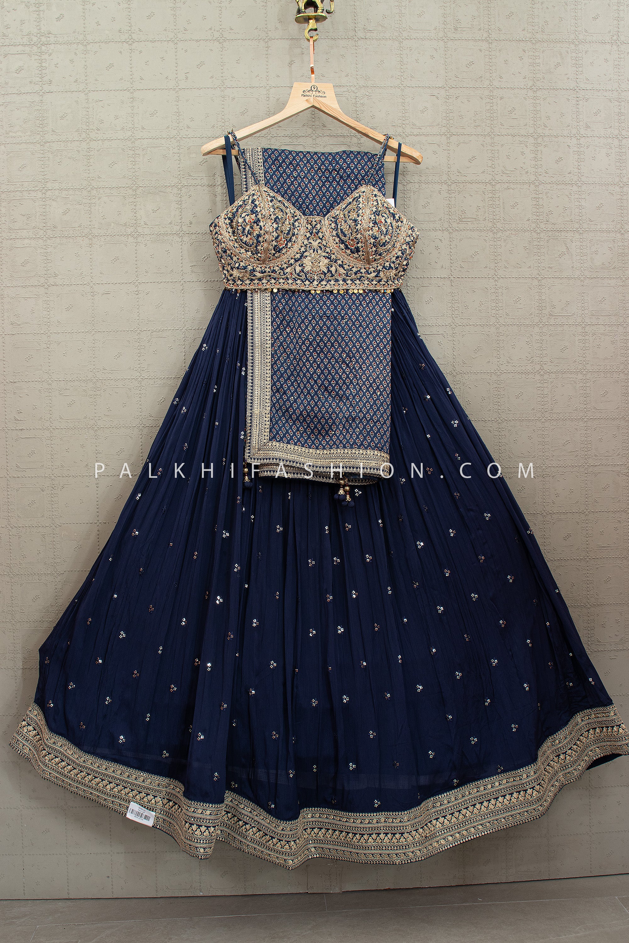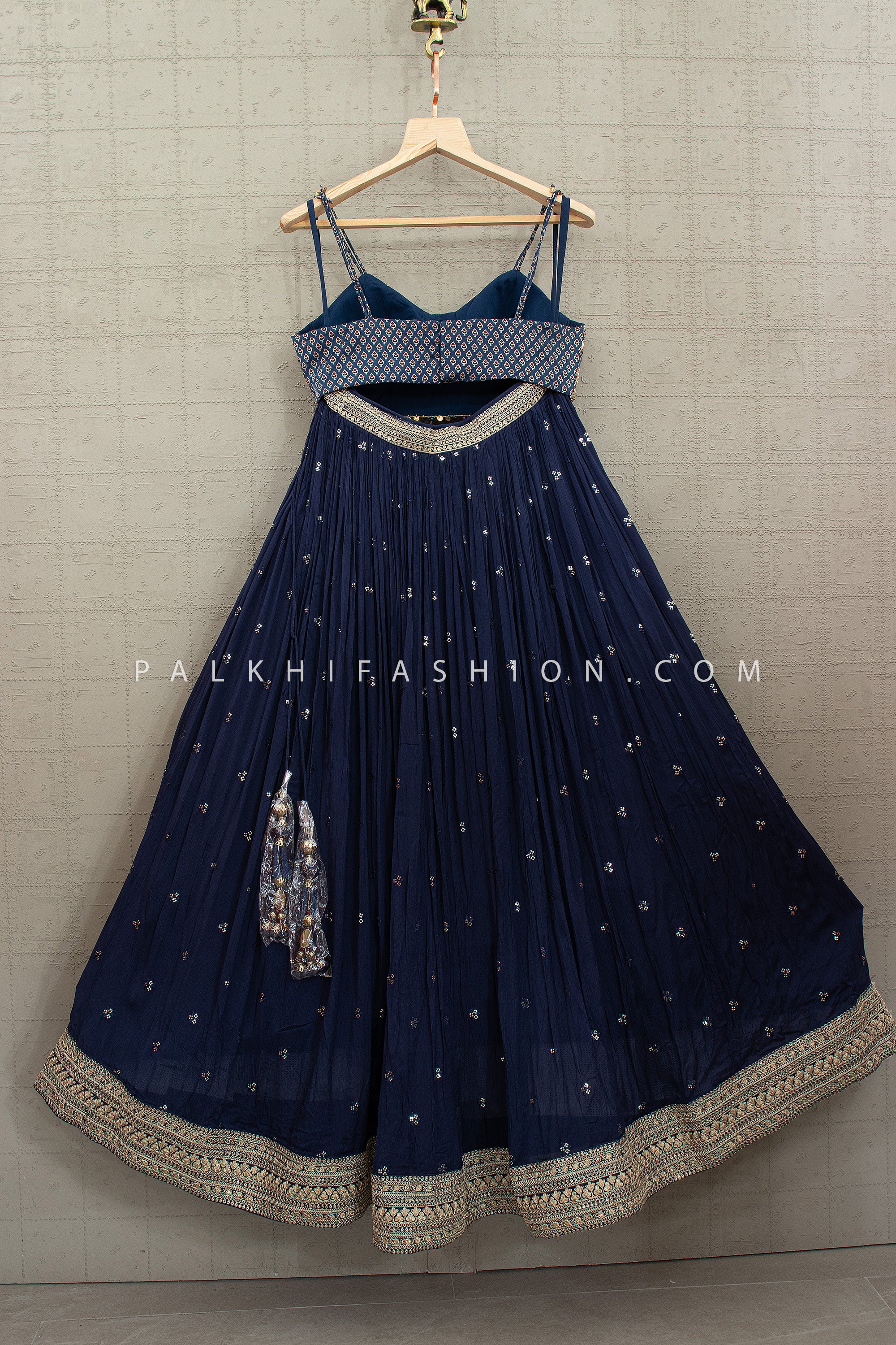 A refined celebration of heritage craftsmanship and modern couture, this navy blue lehenga set beautifully blends traditional Ajrakh artistry with contemporary design. The soft silk spaghetti sleeve blouse is intricately hand embellished with petite stones, sequins, delicate embroidery, and micro-stone detailing that creates a luminous textured surface. The blouse features a graceful silhouette with an appealing open back design that adds modern elegance to the traditional ensemble. The voluminous lehenga flows with a full flared silhouette enhanced by delicate embroidery and subtle embellishments across the panels, finished with an ornate embroidered hem border. The true showstopper is the pure Ajrakh printed dupatta framed with an elegant zari border, creating a perfect fusion of heritage textile artistry and contemporary fashion from Palkhi Fashion Houston USA.