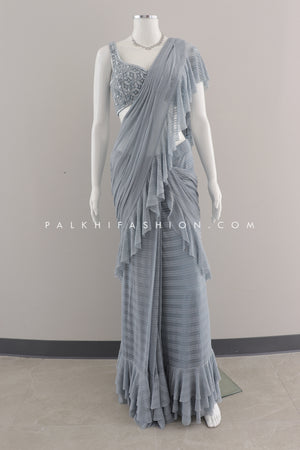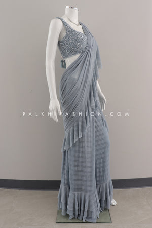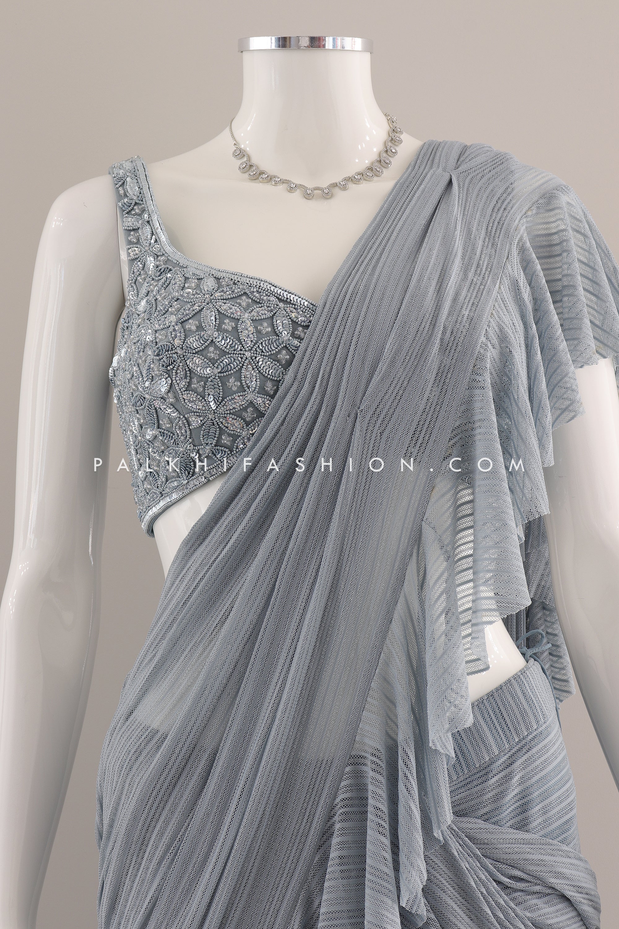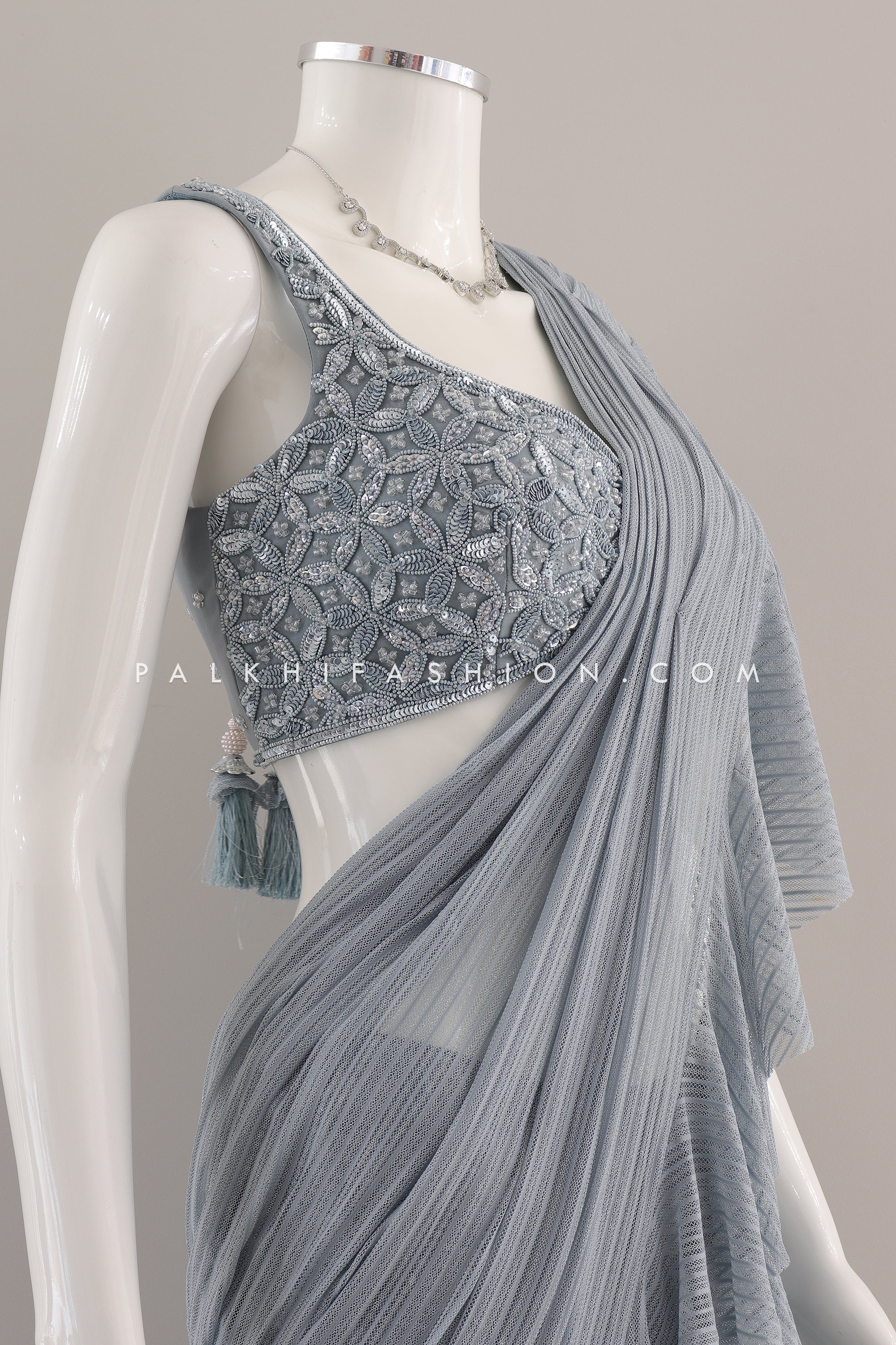 Powder Blue Ready to Wear Saree with Stone & HandWork - Palkhi Fashion