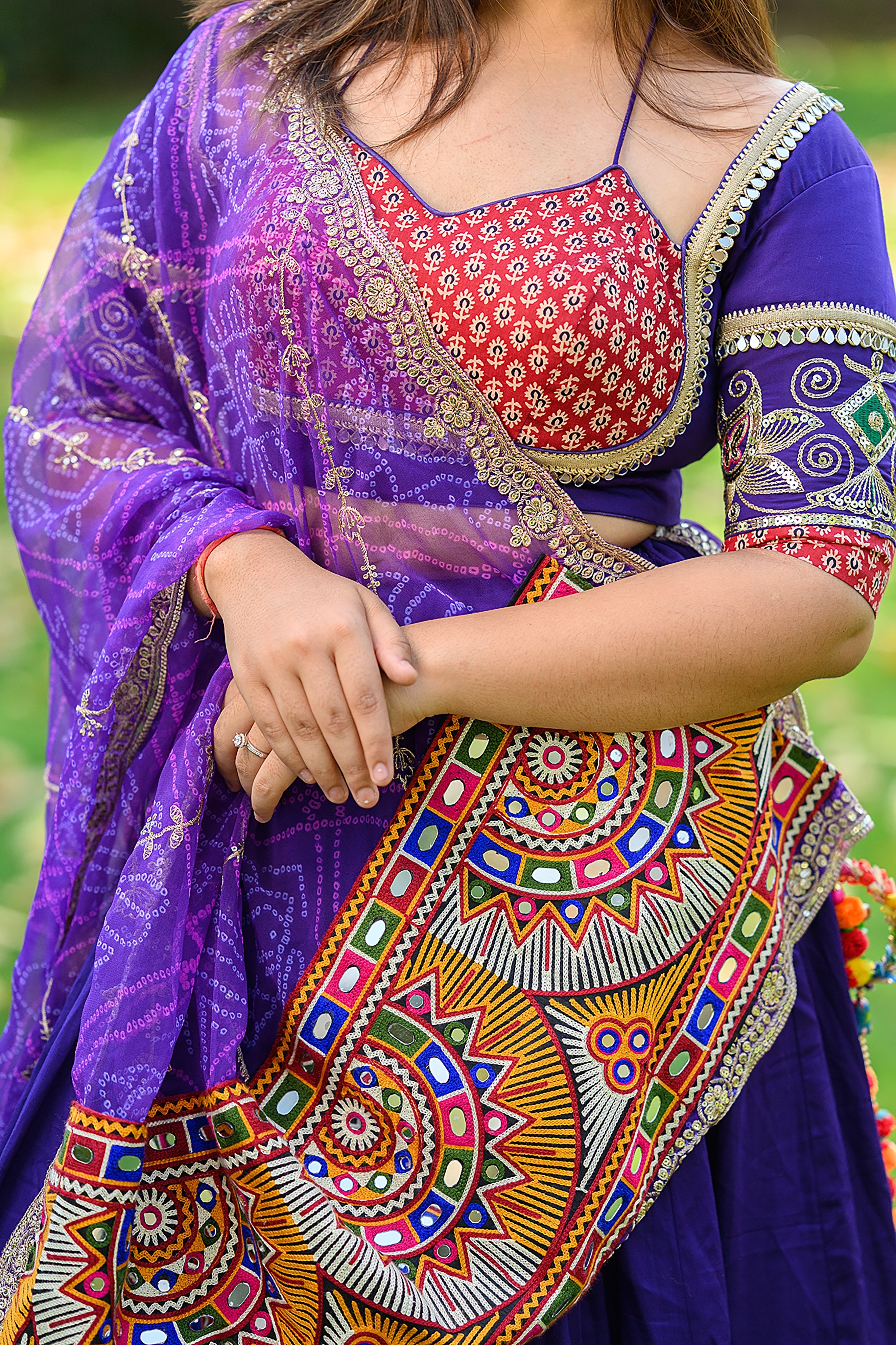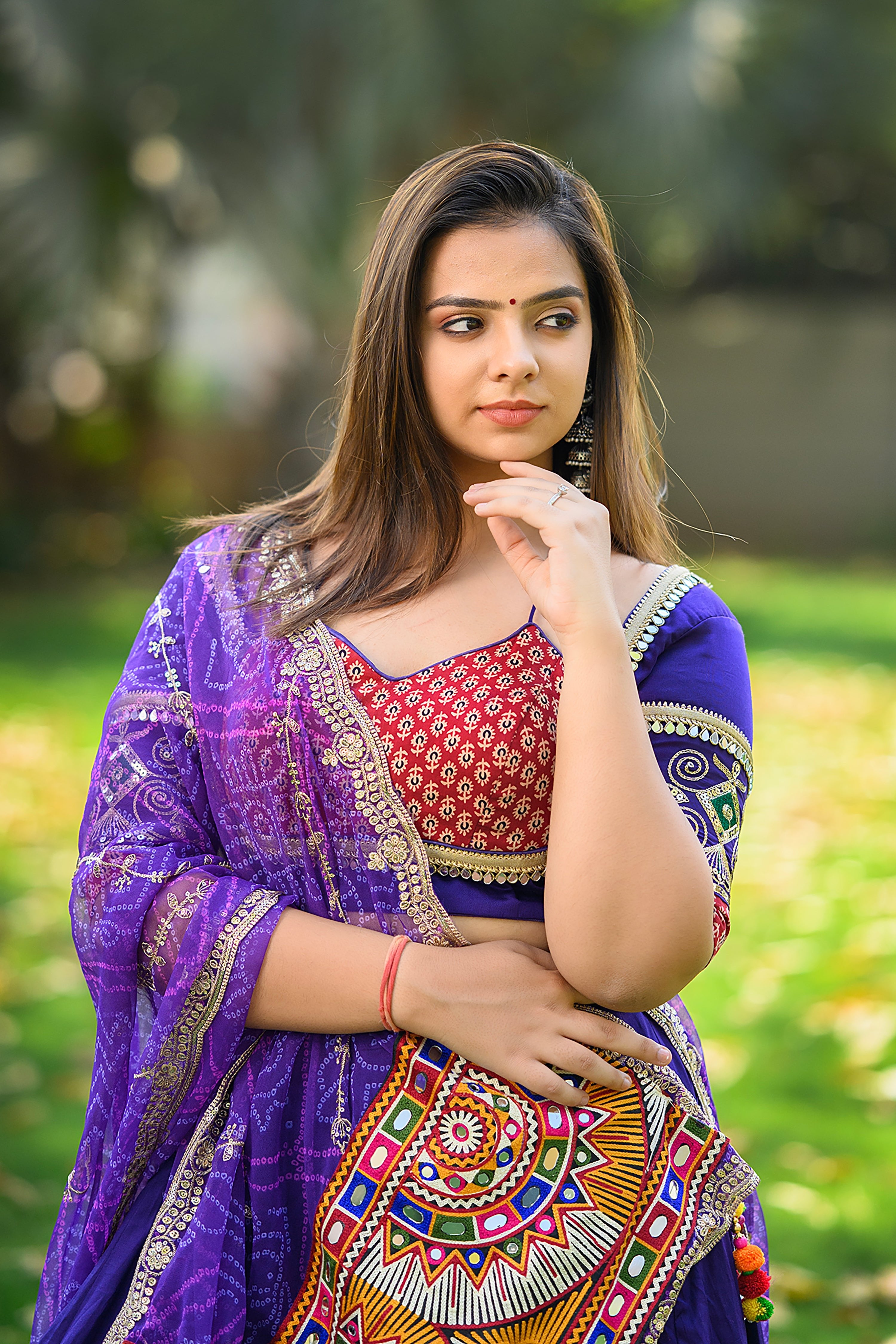 Turn heads this Navratri in this Purple Cotton Silk Chaniya Choli from Palkhi Fashion, a masterpiece of craftsmanship and culture. The lehenga flaunts elegant Ajarakh designs paired with refined thread work and artistic vintage patterns. Matching blouse combines mirror work, ajrakh prints, and vintage patchwork. Cut of the blouse represents outstanding craftsmanship and gives a beautiful fusion and an edgy take on traditional chaniya choli. The look is completed with a vibrant bandhani cut work dupatta, detailed with mirror embellishments, gamthi embroidery, and a decorative border, making this outfit perfect for Garba or festive events.