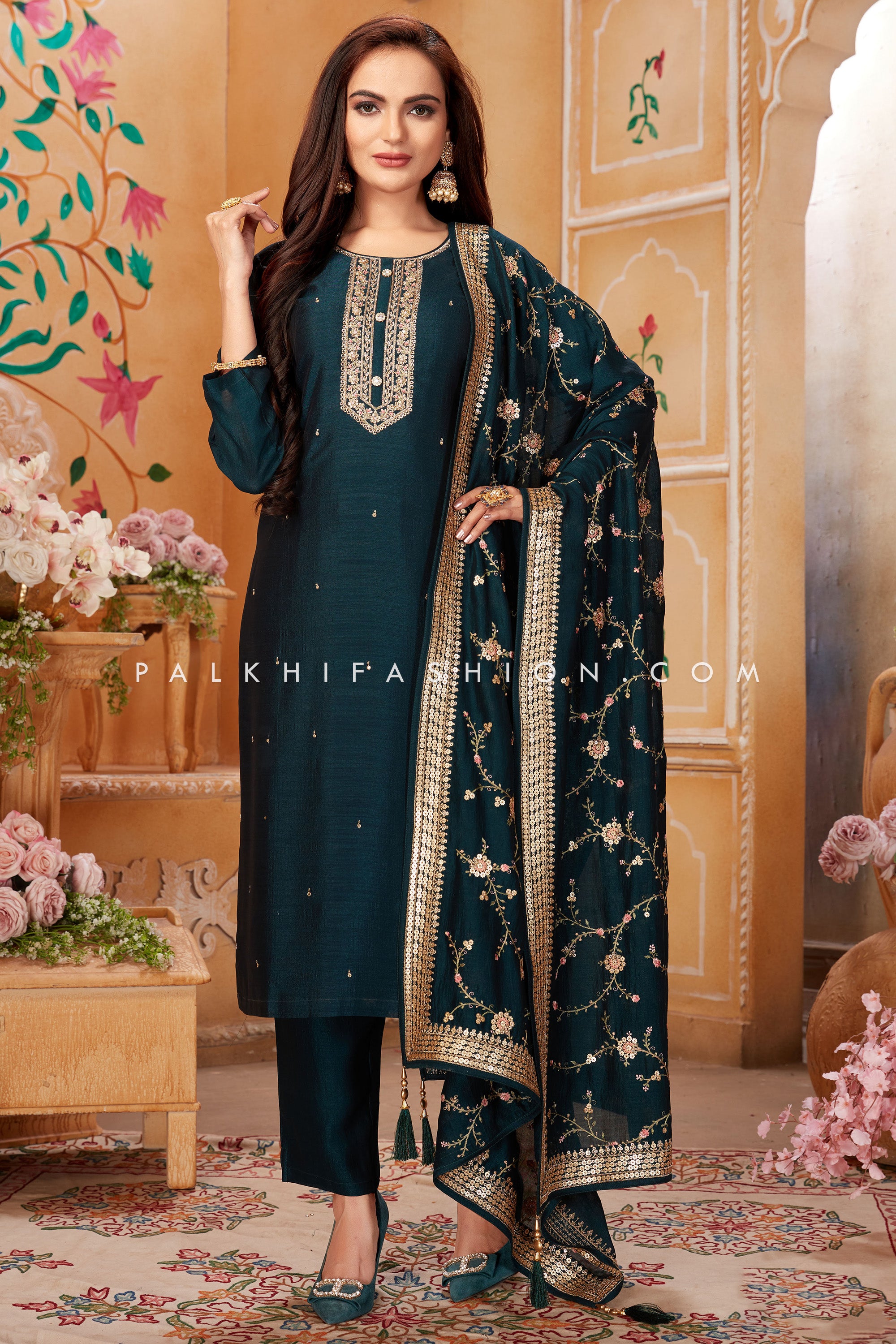 Step into elegance with this rama green Soft Silk Straight-Cut Suit from Palkhi Fashion. The top features sophisticated thread embroidery, and petite sequin embroidery, followed by attractive designs, creating a look that is both enchanting and neat. Accompanied by matching soft silk pants and a dupatta adorned with eye-catching embroidery.