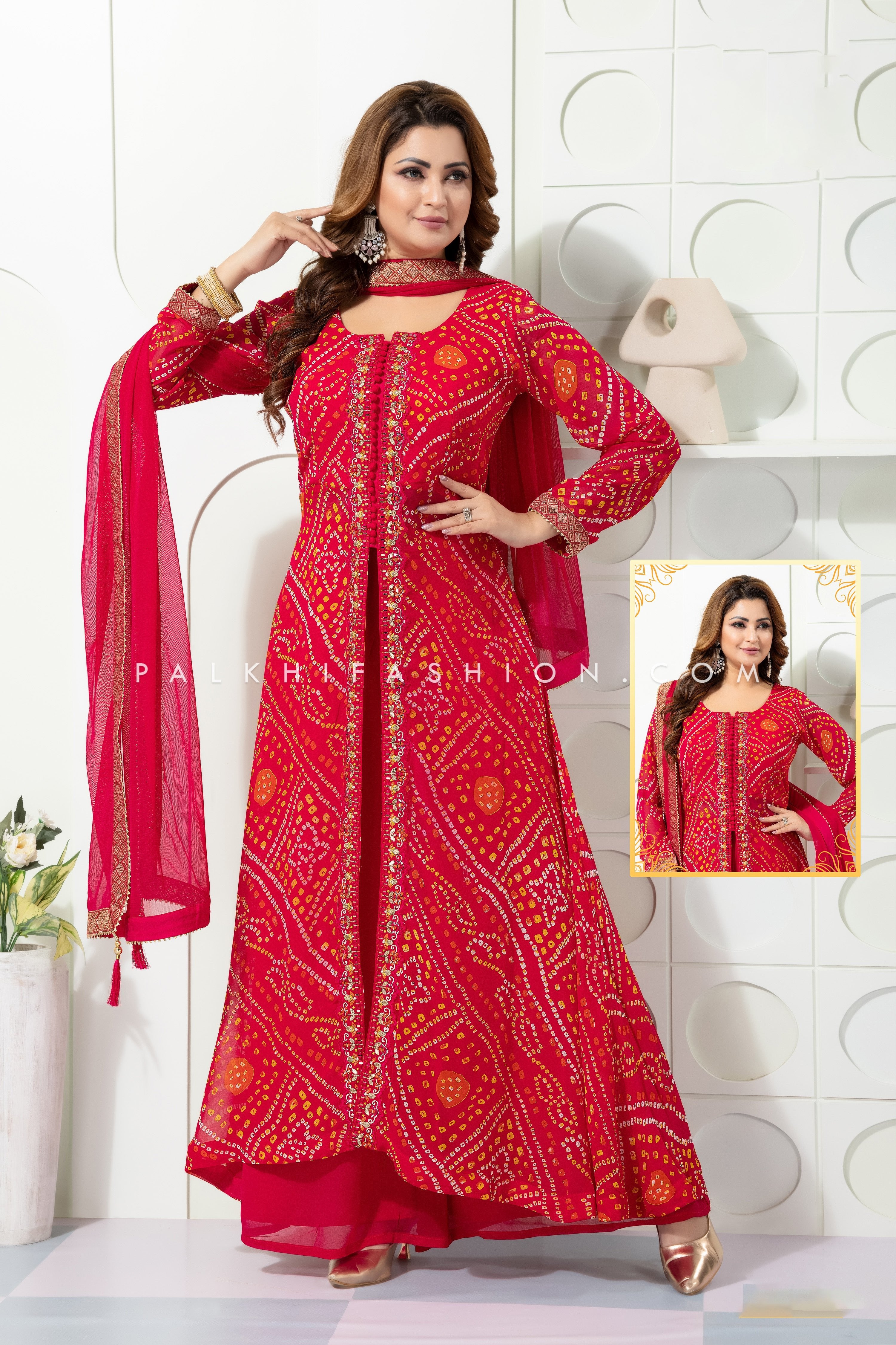 Rani Pink Georgette Front Slit Palazzo Outfit with Bandhani - Palkhi Fashion