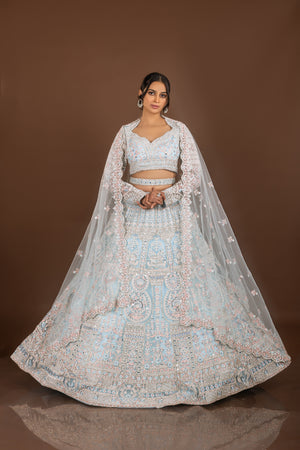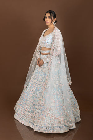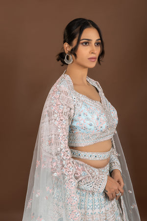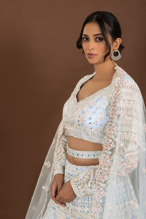 Regal Glam: Powder Blue Designer Lehenga Choli with Mirror and Pearl Work