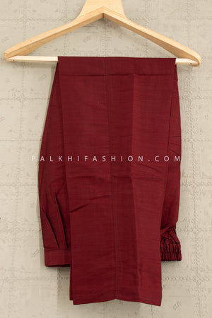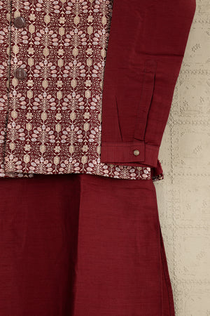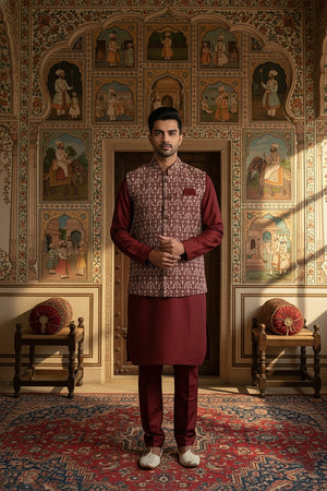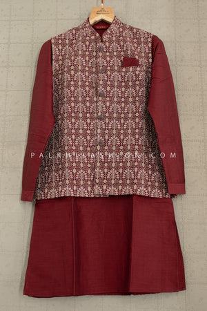 Step into heritage sophistication with this meticulously crafted Maroon Kurta Jacket Set from Palkhi Fashion. The brocade jacket features luxurious resham, thread & petite sequin detailing that creates an eye-catching festive shimmer. Paired with a solid maroon kurta and straight pants, this outfit delivers classic royal charm with modern refinement.