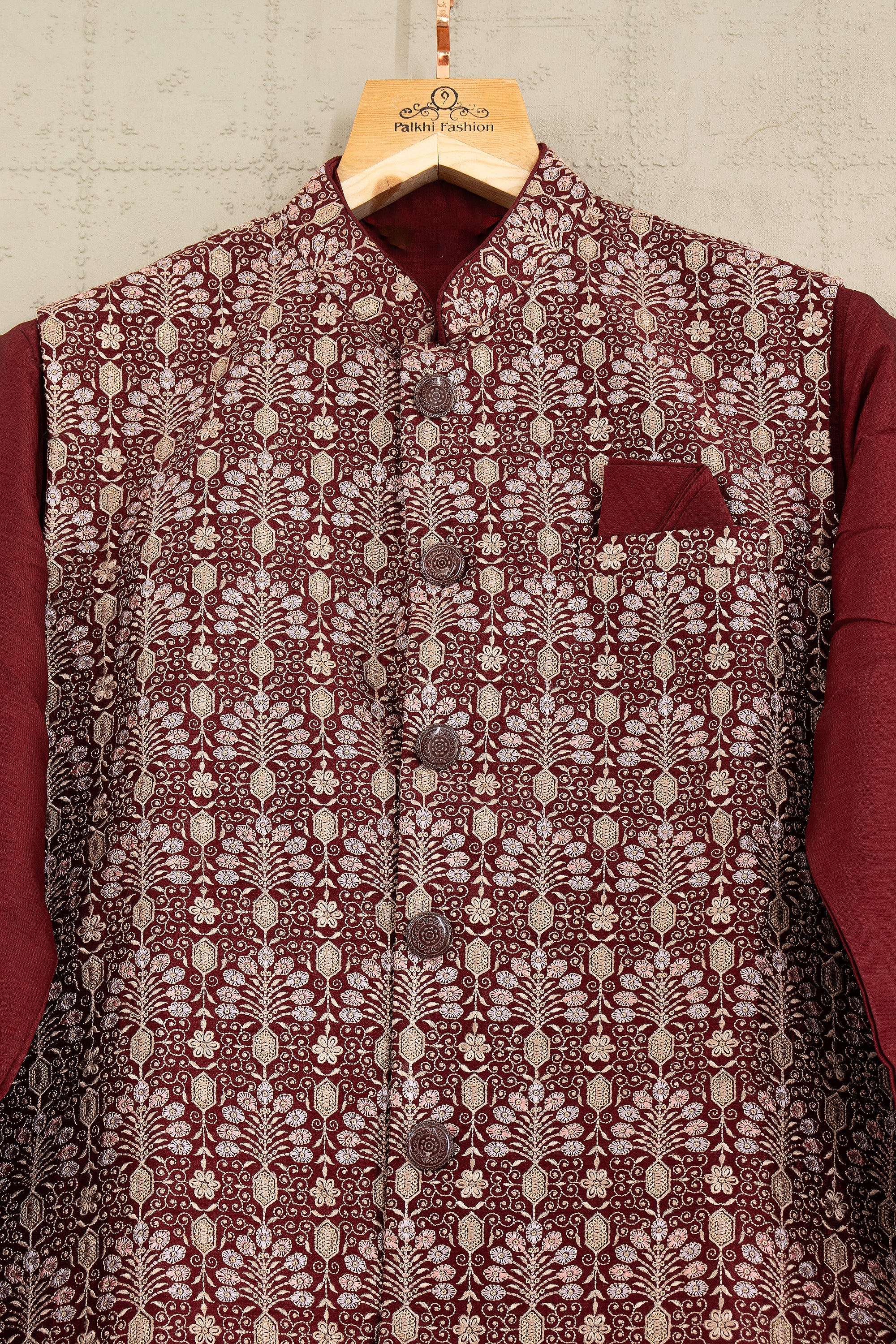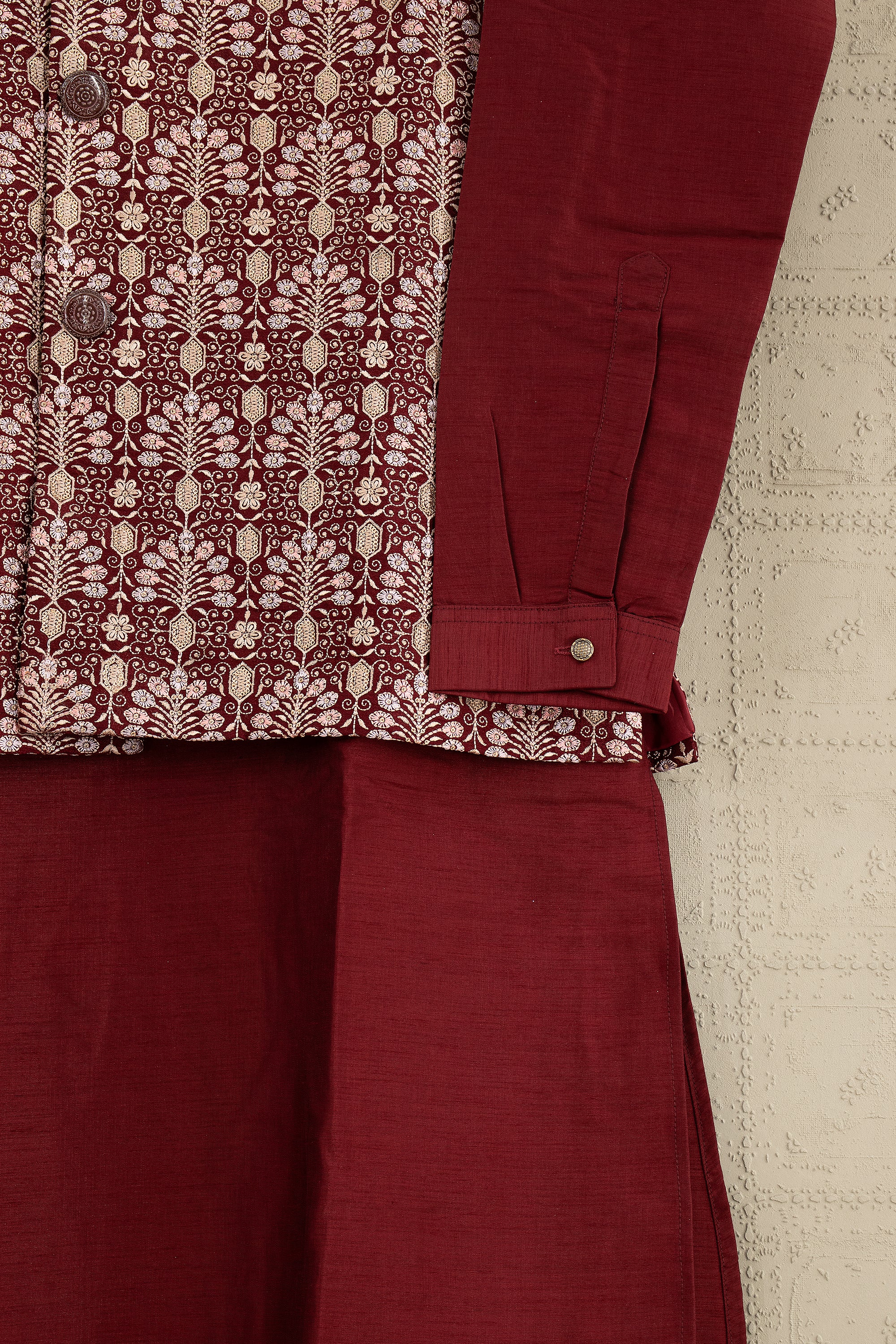 🥀 Regal Maroon Embroidered Kurta Jacket Set – Palkhi Fashion