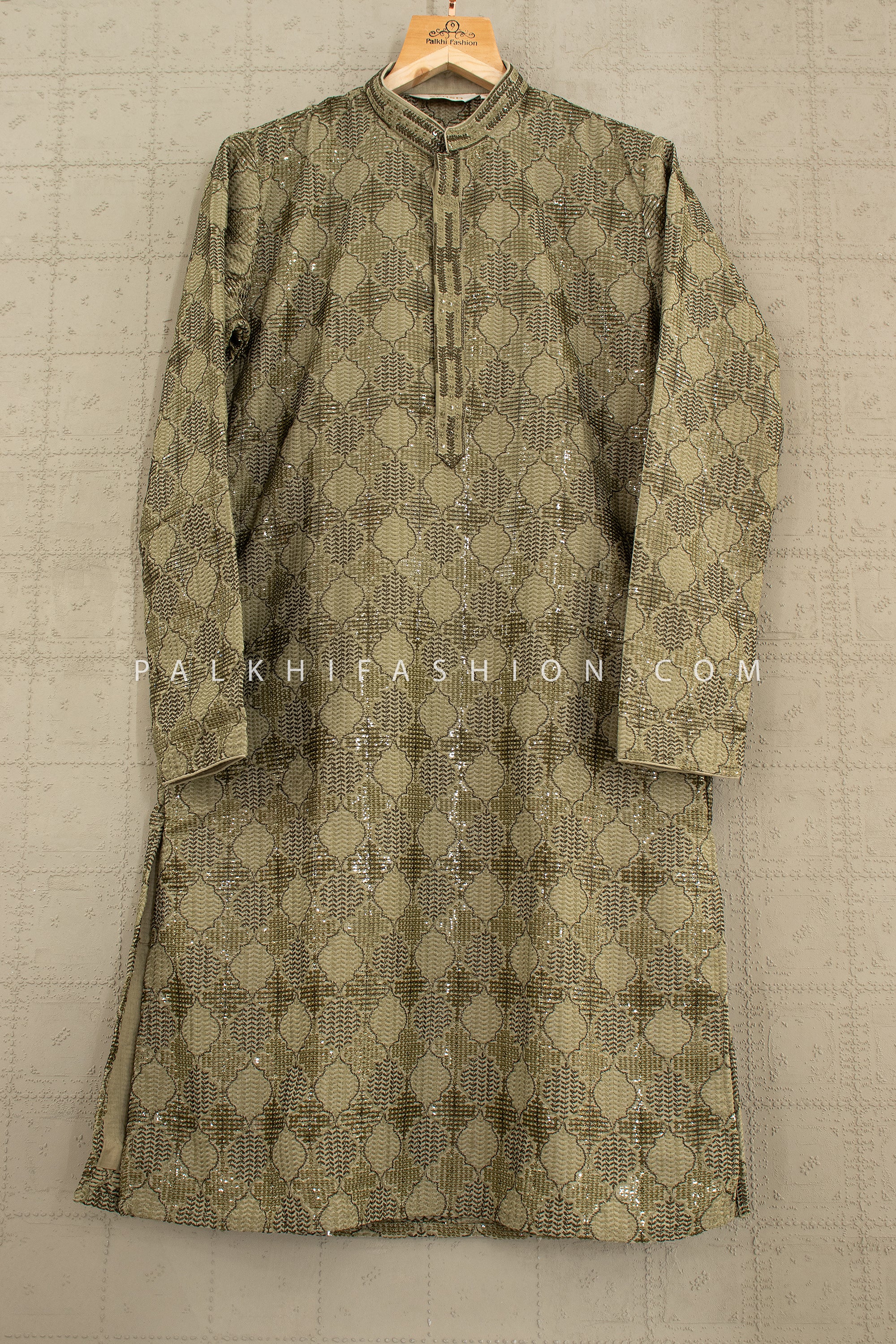Regal Mehndi Green Sequin Embroidered Kurta Set with Off-White Pants – Palkhi Fashion