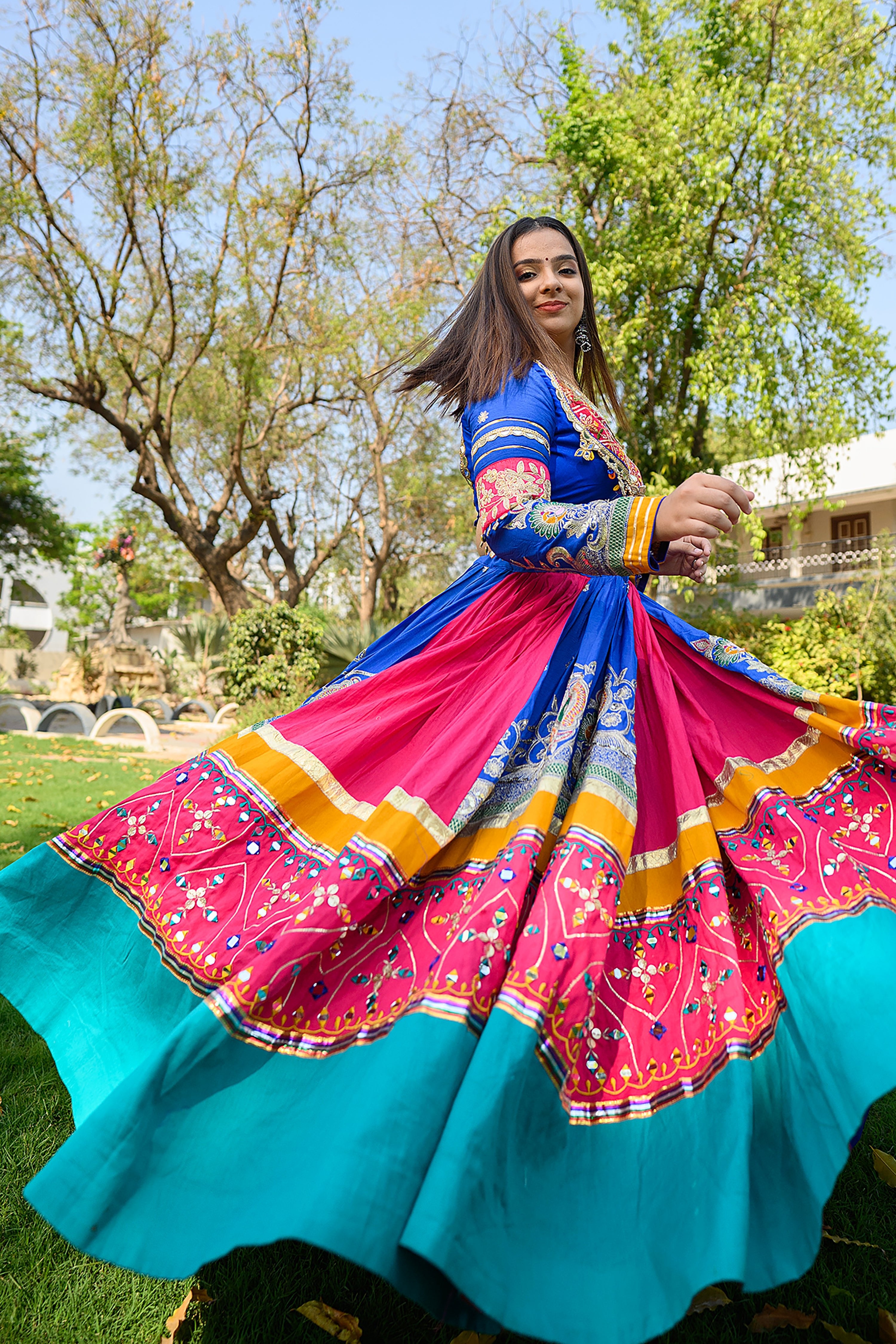 Experience Navratri grandeur with this 15-Meter Full Flair Blue/Rani Pink Chaniya Choli from Palkhi Fashion, your go-to for stunning Navratri ensembles. Crafted with a beautiful blend of vintage thread embroidery, handwork, kutchi, and mirror detailing, this full-flair lehenga mesmerizes with every twirl. The blouse stands out with mirror work, thread embroidery, and traditional patchwork, paired with a captivating cut. Completing the look is a rain-colored black cotton dupatta featuring aari, resham, and traditional motifs, making this outfit perfect for Garba nights and dandiya celebrations.