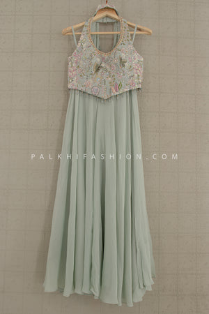 Sage Serenity: Handcrafted Halterneck Palazzo Ensemble by Palkhi Fashion