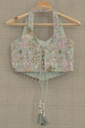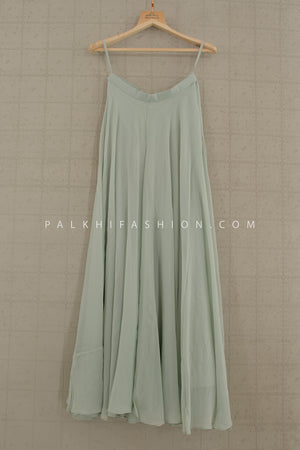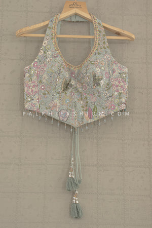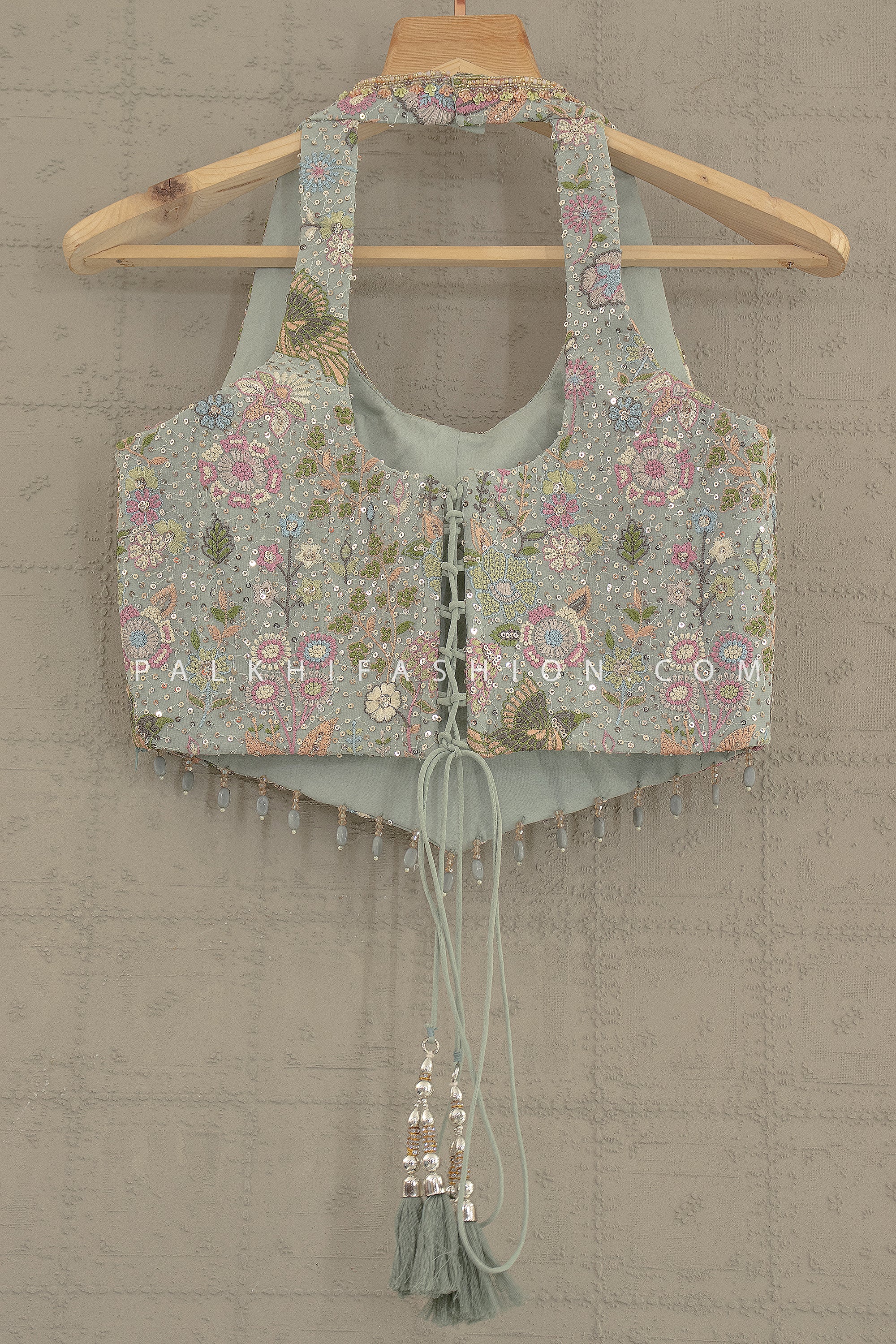 Soft as a morning breeze, this Sage Green( pastel green) Palazzo Set by Palkhi Fashion redefines modern elegance with timeless charm. The halterneck corset top is a masterpiece of intricate hand embroidery—adorned with pastel threadwork, delicate sequins, mirrors, beads, cutdana, and shimmering stones that dance in light. The flowing georgette palazzo and chokar style dupatta drapes gracefully, offering movement that feels ethereal and effortless.