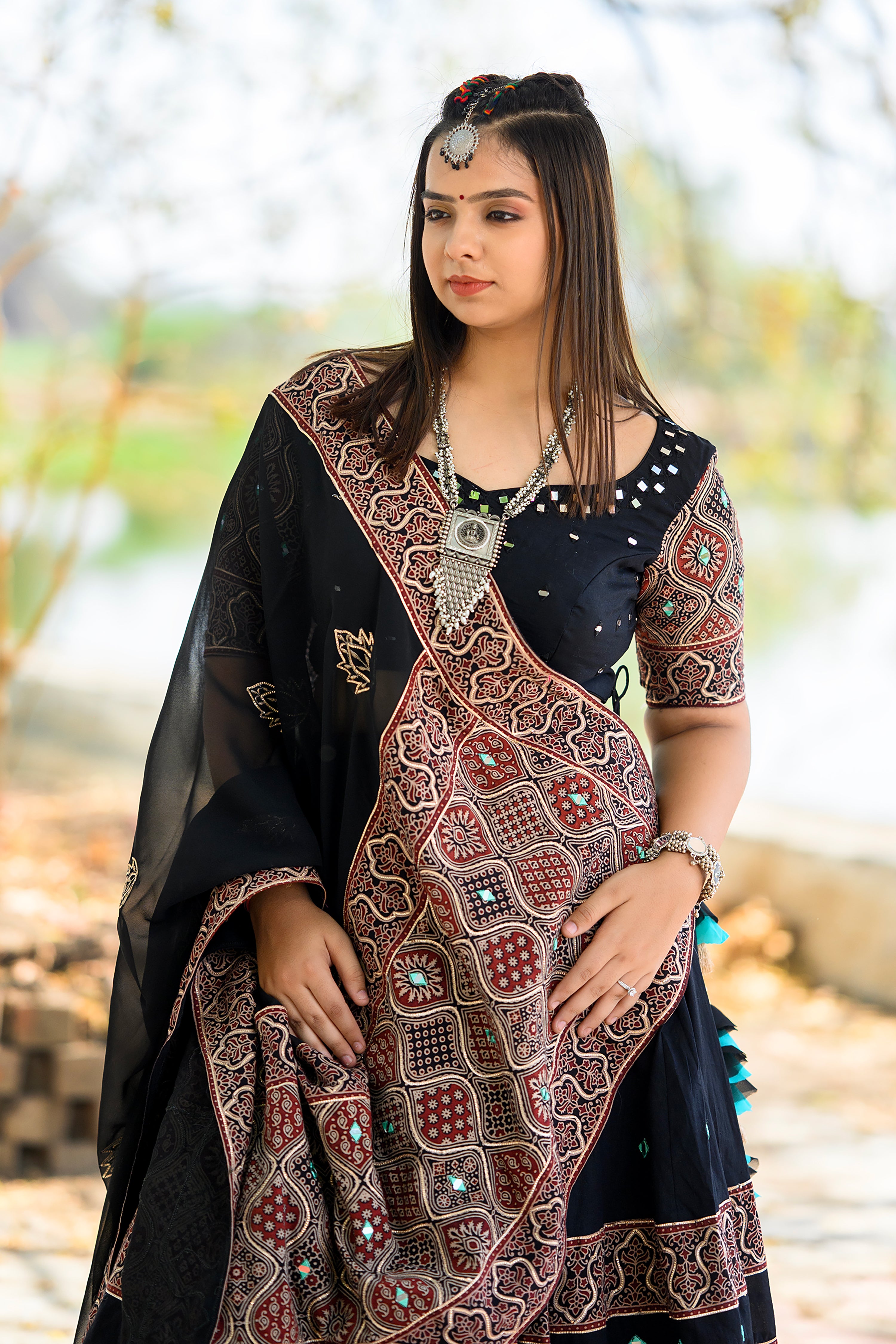 Step into tradition with Timeless Black Ajarakh Navratri Chaniya Choli from Palkhi Fashion. Featuring 12-meter flair lehenga, this outfit is beautifully crafted with Ajarakh block print, mirror work, and intricate thread embroidery. The matching blouse showcases traditional Ajarakh patterns and mirror detailing, creating a rich, cultural aesthetic. Finished with a black Ajarakh dupatta featuring striking border embroidery, this ensemble captures elegance, heritage, and celebration in one unforgettable look.