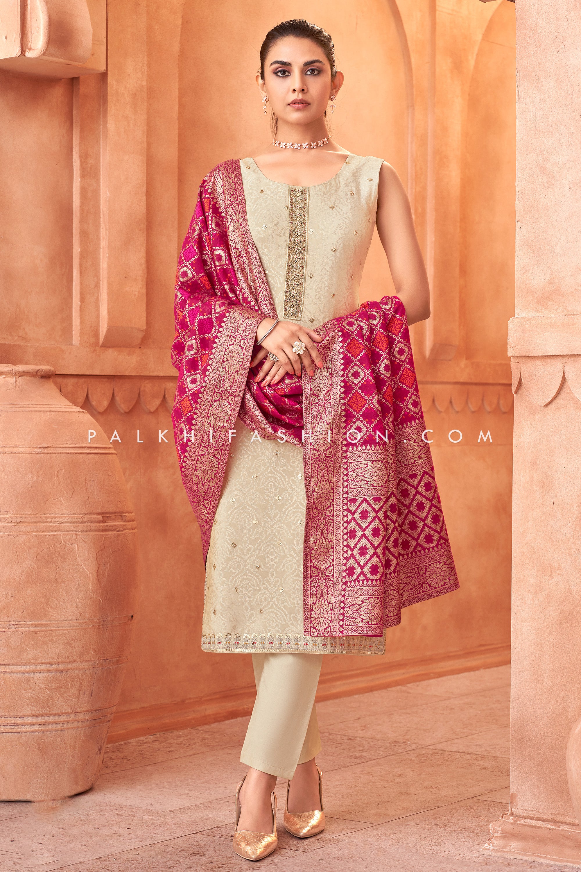 Elevate your style with our enchanting off-white silk Straight-Cut suit. The intricate bandhani and handwork on the top are a testament to unparalleled craftsmanship. The soft silk fabric drapes effortlessly, ensuring all-day comfort. The accompanying rani pink banarasi bandhani dupatta adds a pop of color and completes this exquisite ensemble.