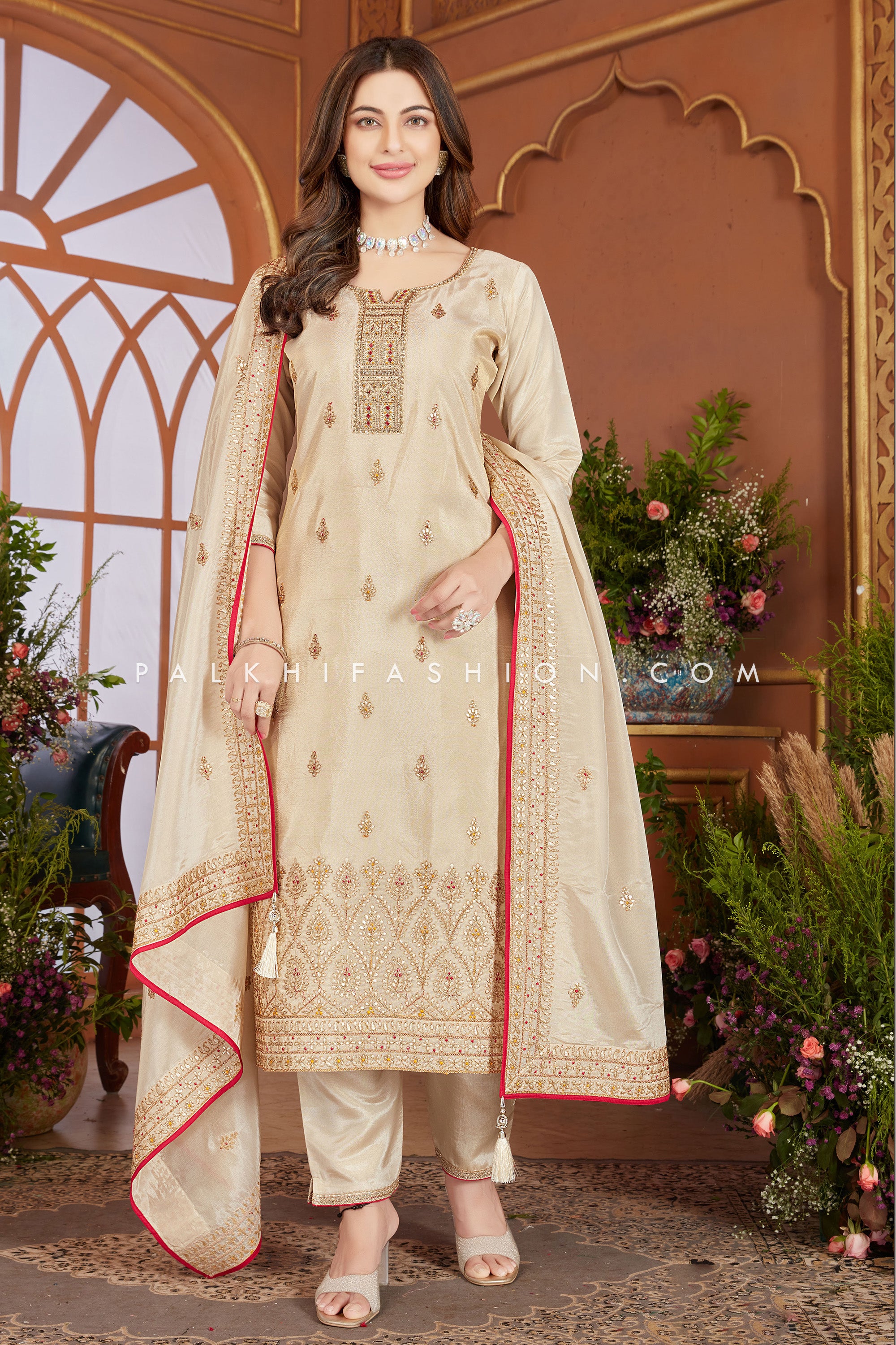 Timeless Off-White Straight Silk Suit with Appealing Work Details
